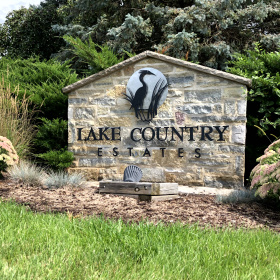Entrances and Common Areas of Lake Country Estates. Areas maintained by the HOA include the lawns at the Main Entrance, the Frontage along Highway C, the Detention Pond and Ripraps.